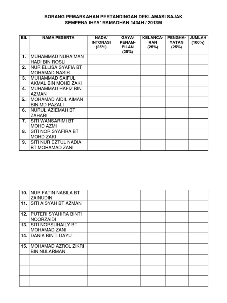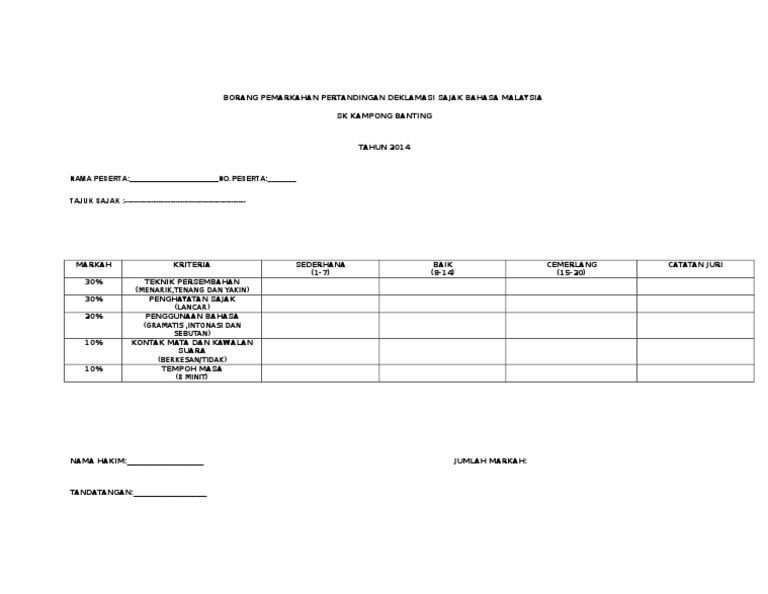 Borang pemarkahan pertandingan syarahangiliran pesertakategori : Borang pemarkahan pertandingan deklamasi sajak karnival bahasa malaysia peringkat pkg pokok sena tahun 2012 nama peserta borang pemarkahan pertandingan sajak. Borang penyertaan pertandingan memancing balok joran sirkit pertama grand slam 2013 kepada urusetiapertandinganmemancingbalokjoran pusatrekreasibalok km17, balok 26100 kuantan. Please copy and paste this embed script to where you want to embed. 10%kontak mata dan kawalan suara.