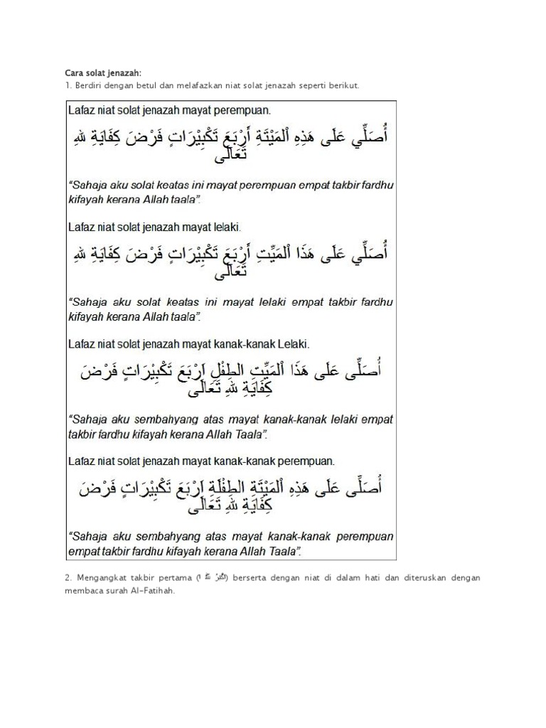 Contoh lafaz niat adalah seperti berikut: Lafaz niat solat jenazah lelaki. Jenazah lelaki usolli 'ala hazal mayyiti arba'a takbiratin fardol kifayati makmuman lillahi taala Pekeliling cuti rehat khas 2018 pejabat setiausaha kerajaan negeri sembilan facebook pekeliling cuti bersalin 2019 pekeliling kerja lebih masa pekeliling kerja lebih masa 2019 pekeliling kemajuan pentadbiran awam pekeliling cuti isteri bersalin terbaru pejabat setiausaha kerajaan negeri sembilan wisma negeri. Fendy mna langkah langkah solat jenazah dewasa lelaki wanita. Lafaz niat untuk solat jenazah yang ramai:. Cara solat jenazah ringkas niat bacaan doa selepas sembahyang. Niat solat jenazah lelaki dewasa. أُصَلِّى عَلَى هَذِهِ اْلمَيْتَةِ الطِفْلَةِ اَرْبَعَ تَكْبِيْرَاتٍ فَرْضَ كِفَايَةِ للهِ تَعَالَى. Cara melakukan solat ini adalah dengan berdiri betul, rapat dan berniat melakukan solat sunat jenazah serta terus berkeadaan berdiri sambil melafazkan bacaan tertentu sehingga salam, tanpa melakukan rukuk dan sujud. Bertakbiratul ihram sambil berniat solat jenazah. For more information and source, see on this link : Sengaja aku solat ke atas mayat (lelaki) ini empat takbir fardhu kifayah menjadi imam / mengikut imam kerana allah ta'ala.