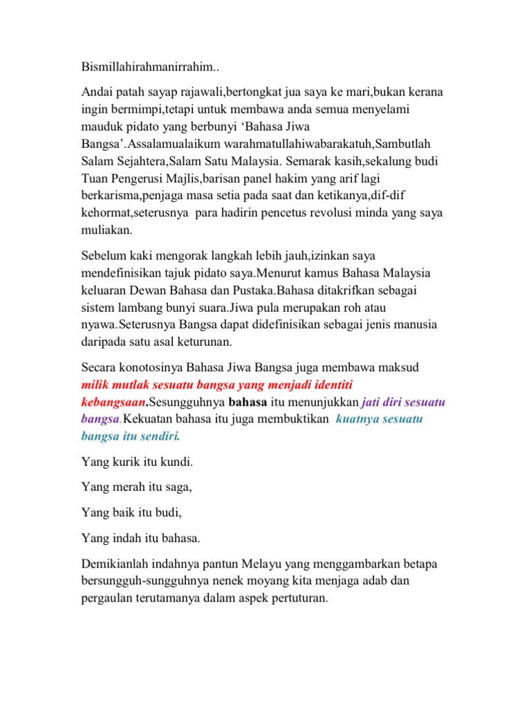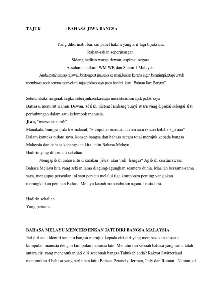 Pidato Bahasa Jiwa Bangsa - Sebagai pemuda generasi penerus bangsa sangat.. Savesave pidato bahasa jawa for later. Pidato bahasa jawa atau disebut juga dengan sesorah dalam bahasa indonesia berarti menyampaikan sebuah gagasan ataupun informasi dengan menyampaikannya di depan banyak orang untuk tujuan tertentu. Kula panjenengan sedaya tamtu sampun sami mangertos bilih tanggal 28 oktober bangsa indonesia mengeti dinten sumpah pemuda. Bapak kepala sekolah ingkang kinurmatan. Pidato merupakan salah satu aktivitas yang umum digunakan dalam berbagai acara tertentu.
